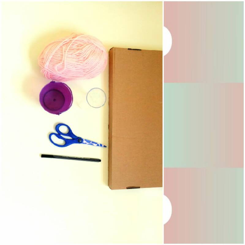 Leg de twee kartonnen cirkels op elkaar. Knip ongeveer 5 draden van 2/3 meter wol en knoop ze aan elkaar. Knoop de woltouwtjes vervolgens vast aan het karton